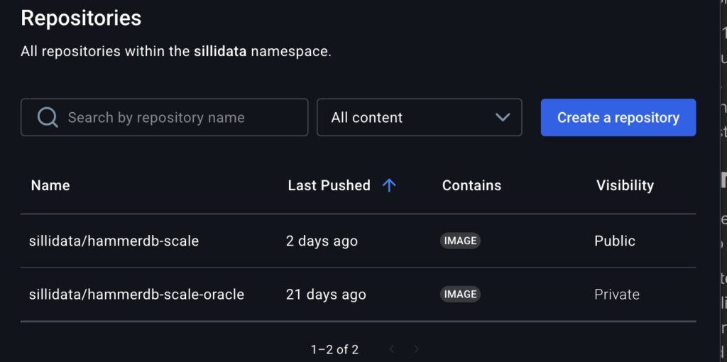 The build downloads Instant Client from Oracle, installs it into the container, and configures the Oracle-specific HammerDB TCL scripts. Takes about five minutes. Once it’s in your registry, you’re done with the build process.
