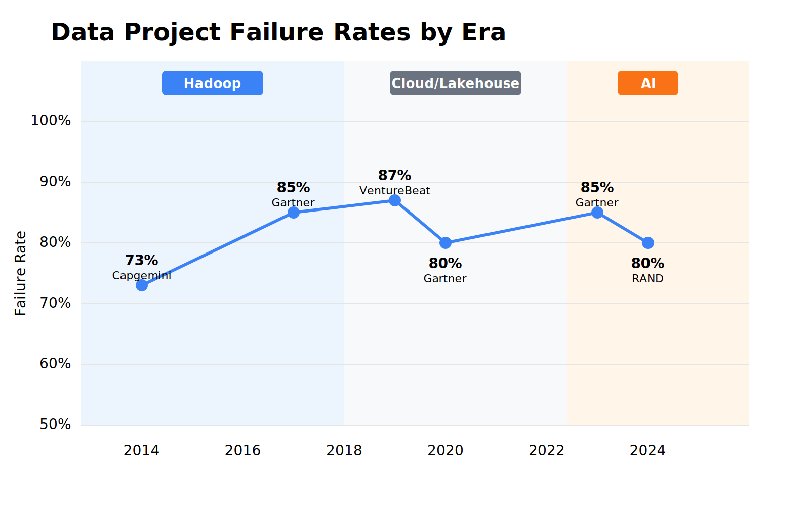 You’ve seen the failure statistics before. Capgemini found 27% success in 2014. Gartner’s Nick Heudecker later admitted their 60% failure estimate was “too conservative,” the real number was closer to 85%. Lakehouse era: still above 50%. Then AI arrived: RAND found over 80% of AI projects fail, twice the rate of non-AI IT. The technology changed completely. The failure rate didn’t.