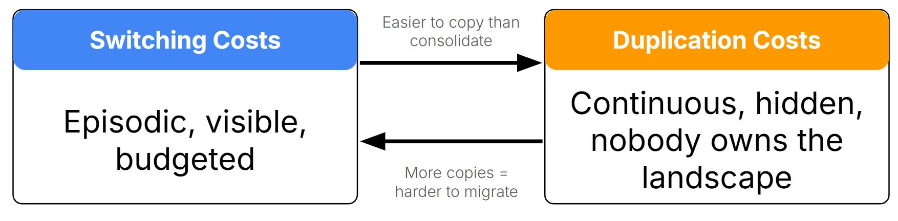 But they feed each other. High duplication makes switching harder: more copies means more to migrate. High switching costs encourage duplication: it’s easier to copy data into yet another system than to consolidate. Most enterprises sit in the intersection, paying both simultaneously.
